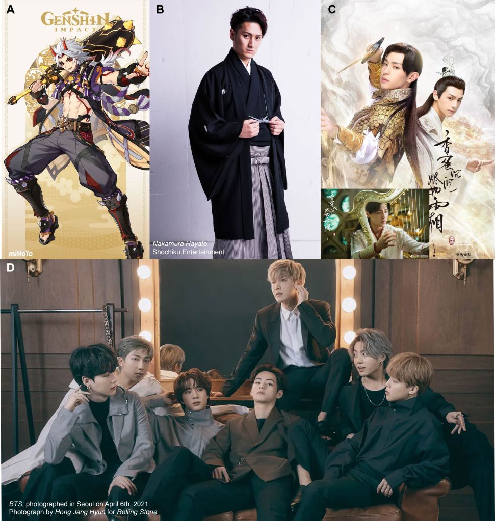 How men are portrayed in East Asian pop culture. (A) A character from Chinese role-playing video game, Genshin Impact. Arataki Itto is a member of red demon race and was the buffest dude in the game. He would have looked closer to Red Hulk if he were in a Western video game. (B) Japanese Kabuki theater actor, Nakamura Hayato. He will play Yamato Takeru in Super Kabuki, 2024. (C) Chinese Wuxia TV series, Ashes of Love (2018). While not wielding a sword, the main hero plays a string instrument. (D) K-pop superstar boy band, BTS. Currently, BTS is on hiatus because the members are serving their time in the South Korean Military.